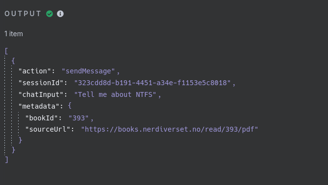 As we can see I can add the book ID in my messages. So now I need to add my books to the vector database with the correct ID. I suspect this will result in some manual labor. And then have the N8N agent use that reference when looking at specific books. And I also need it to reference the books when asking in general.