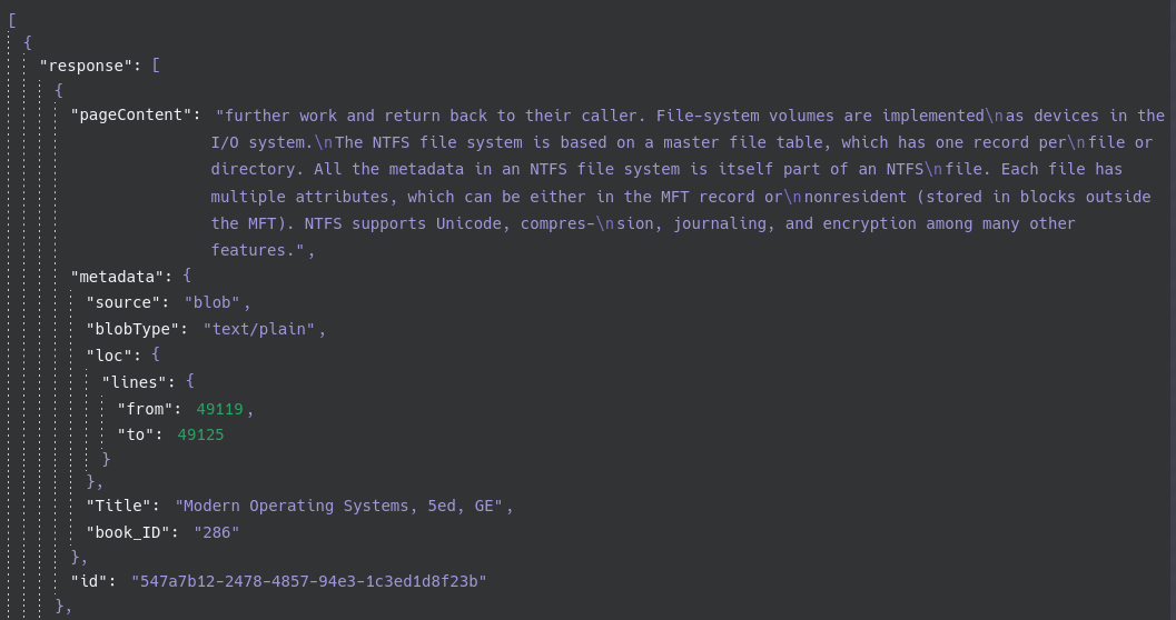The above result from vector DB includes the title and the book_ID. What I have yet to accomplish is to have it use the metadata title as reference when it uses the vectors. This will make it easier for me to look up the information in the books.